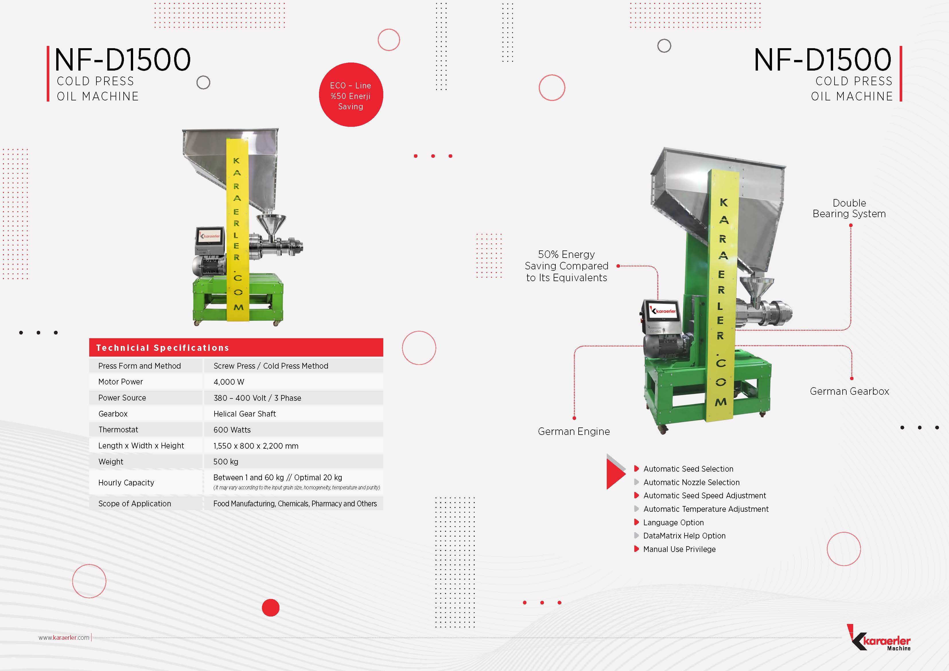 With the NFD1500 machine, which has a 4 KW engine power, you can easily pull even the hardest and hardest seeds (rose nose seeds, pomegranate seeds, evening primrose seeds). There is a 250 kilogram silo system on the machine and it is ideal for high-volume production.